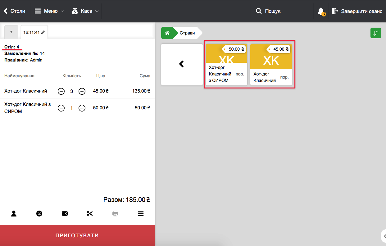 - Додайте товари/страви в чек, які відображаються в правій частині екрану