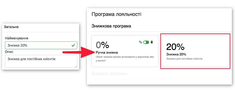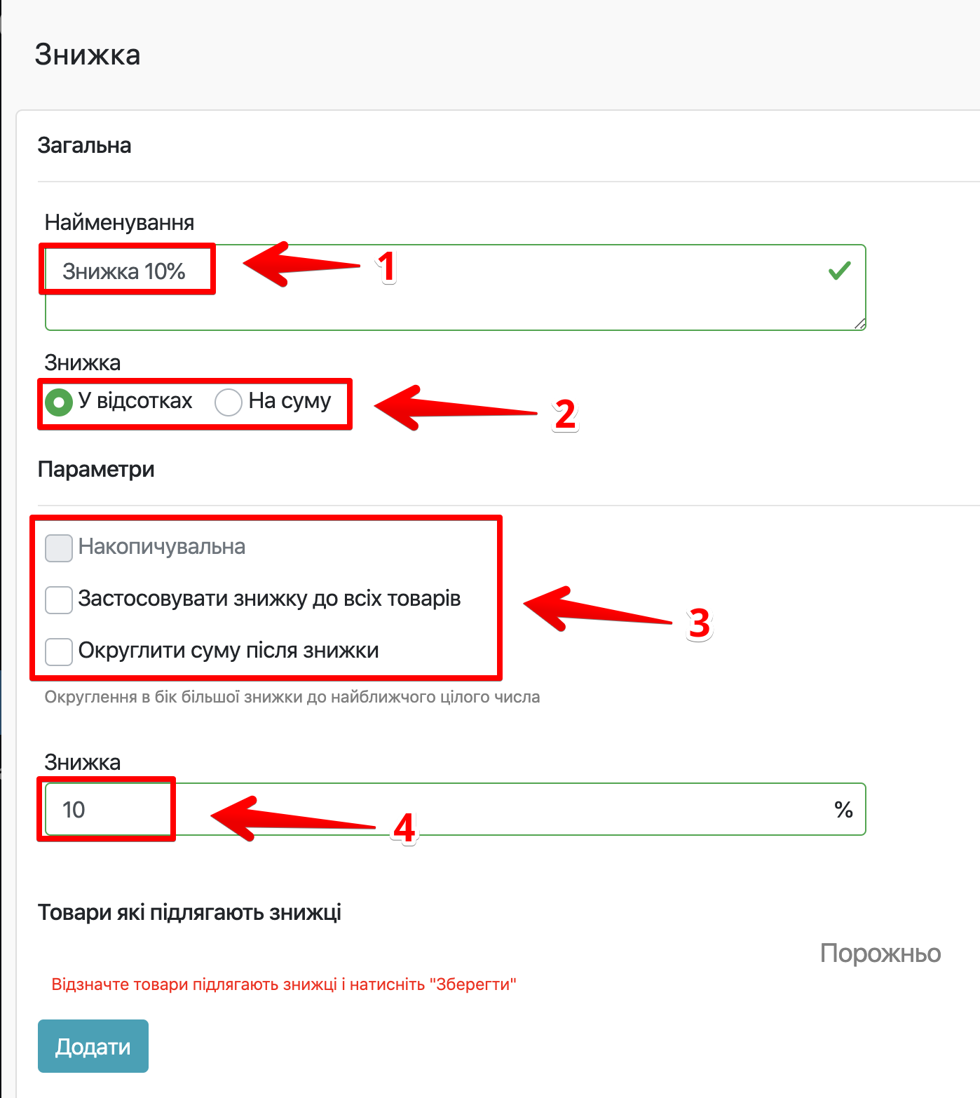 - Введіть відсоток або суму знижки (в залежності від вибору раніше)