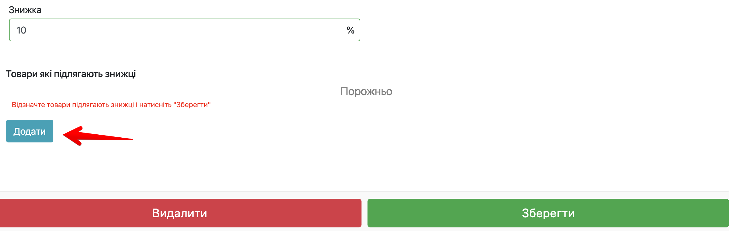 - Додаємо всі необхідні товари які будуть застосовуватися зі знижкою і натискаємо ” Зберегти “, а в кінці натискаємо ” Додати “.