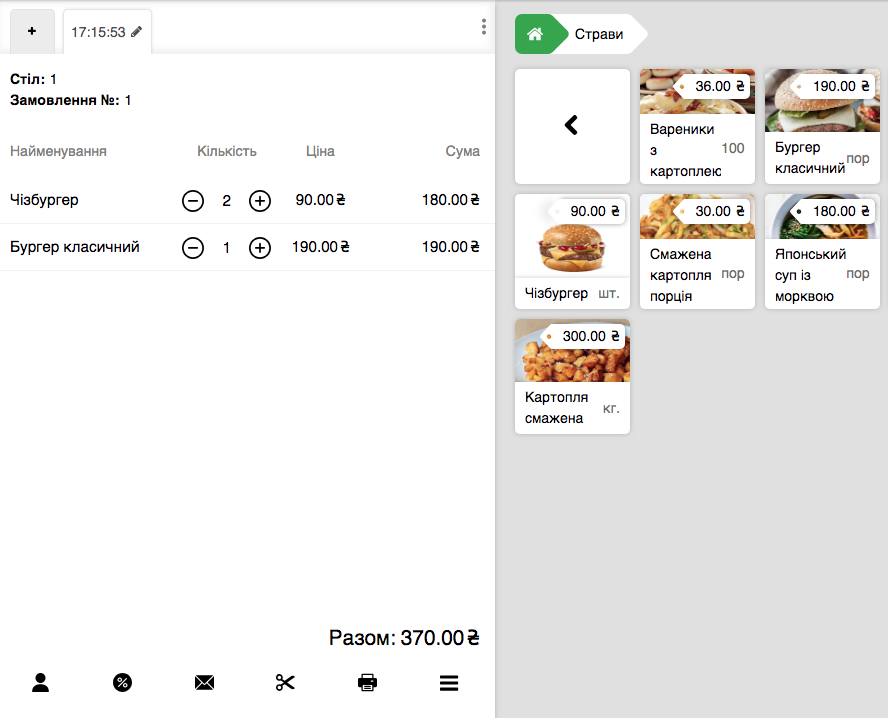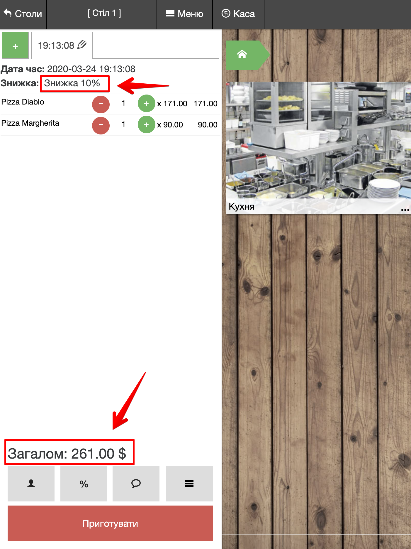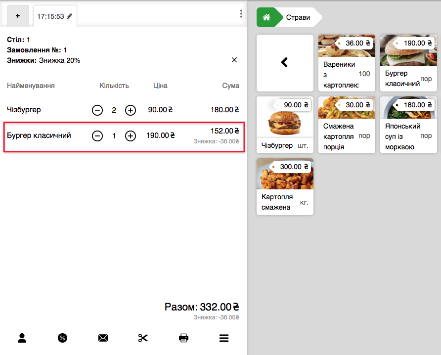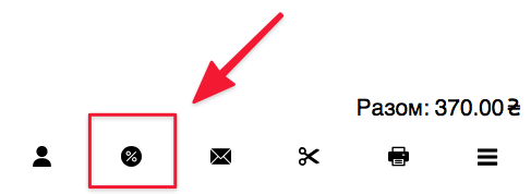 - У нижній панелі Замовлення натисніть на іконку % і виберіть необхідну Знижку