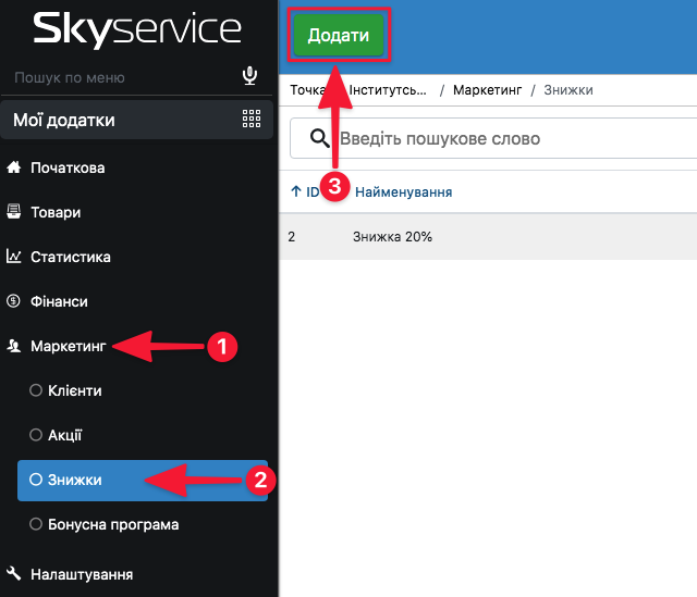 - Заходимо в адмін панель: ” Маркетинг ” – ” Знижки ” – вгорі натискаємо ” Додати “