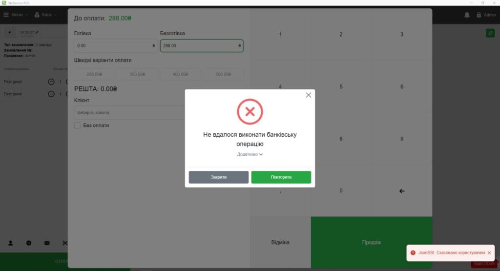 ☝🏻 Якщо на самому терміналі скасувати оплату, то в програмі будуть наступні повідомлення: