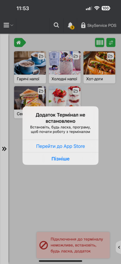 ☝🏻 Якщо додаток “Термінал” встановлено на ваш пристрій IOS, на якому встановлена програма SkyService, то після додавання налаштування та при кожному запуску каси (в цей момент відбувається ініціалізація обладнання), має виникнути повідомлення: