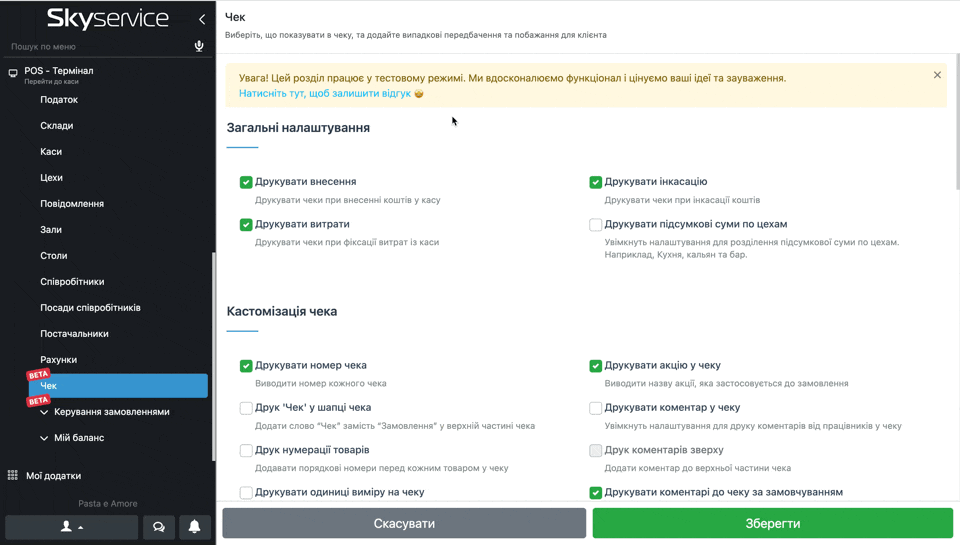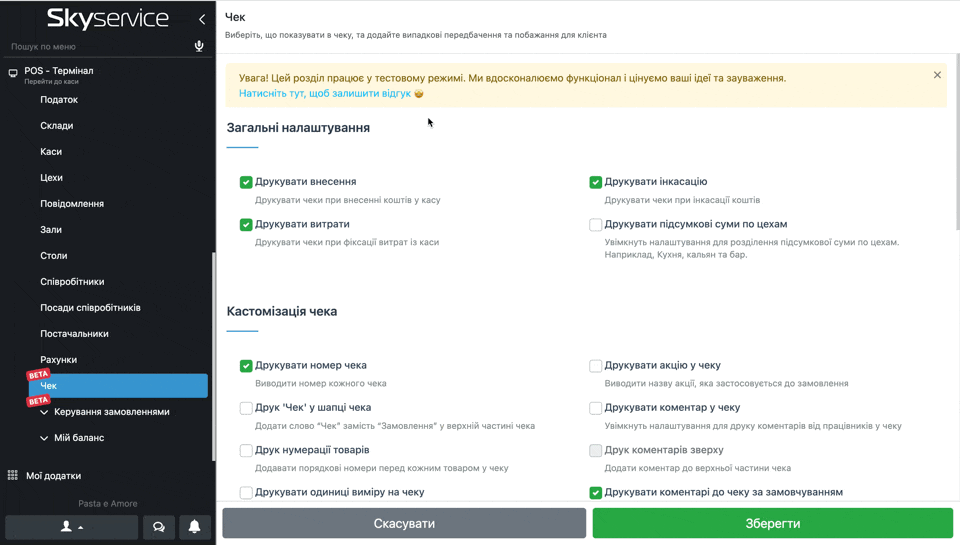 У SkyService ви можете налаштувати зовнішній вигляд нефіскального чека під потреби свого закладу. Це допоможе зробити чек зручнішим для клієнтів та відобразити тільки потрібну інформацію.