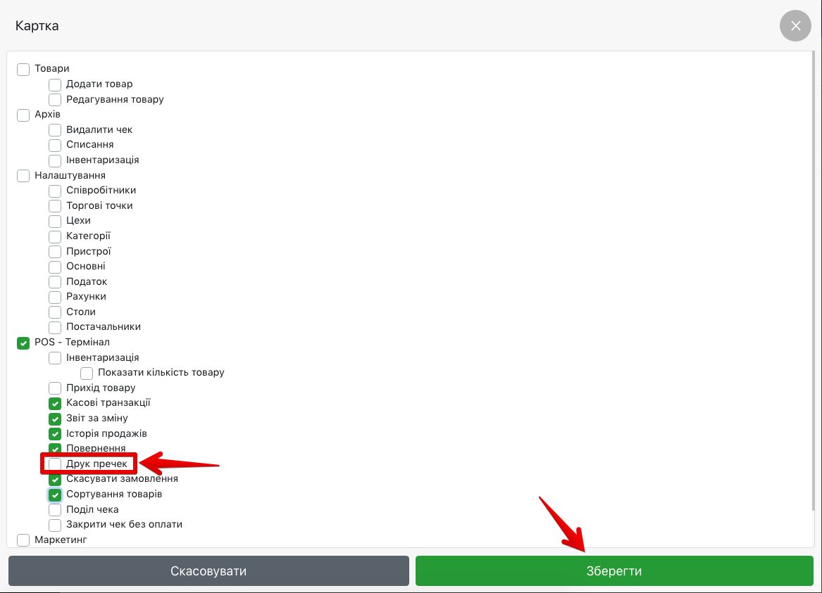 Як відключити друк пречеку Сховайте на терміналі кнопку друку пречеку, щоб офіціанти не змогли друкувати попередній чек У Адмін-панелі перейдіть в розділ Налаштування – співробітники, виберіть співробітника У спливаючому вікні натисніть Права доступу У вікні Права доступу зніміть галочку Друк пречек Натисніть Зберегти Детальніше: Пов'язані уроки Облік сертифікатів оплат в Skyservice Як відключити друк пречеку Як повторно роздрукувати закритий чек Як сортувати товари на терміналі Як закрити чек без оплати Популярні уроки Програмний РРО | Як почати роботу Налаштування принтера Xprinter Як зробити X- і Z-звіти Як налаштувати чековий принтер на Windows Помилки при роботі з пРРО | Як їх виправити