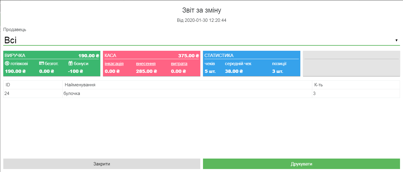 - У Пос-терміналі натисніть Каса – Звіт за зміну
