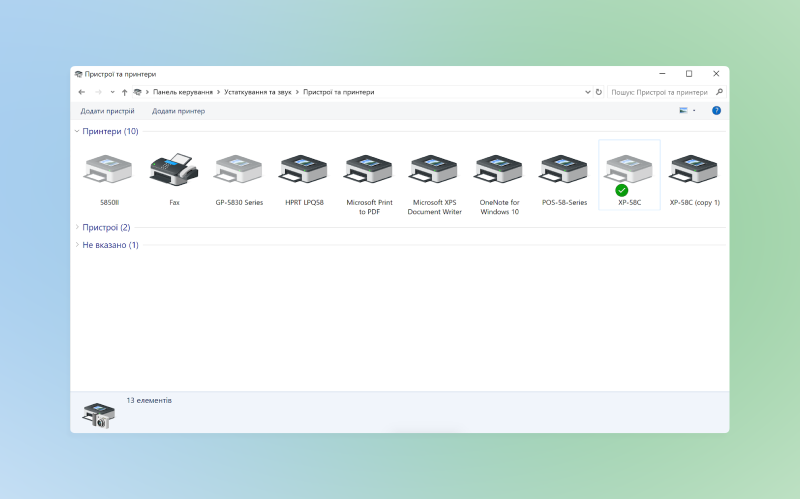 Заходимо в Панель управлінняУстаткування та звук (опціонально) ➜ Пристрої та принтери