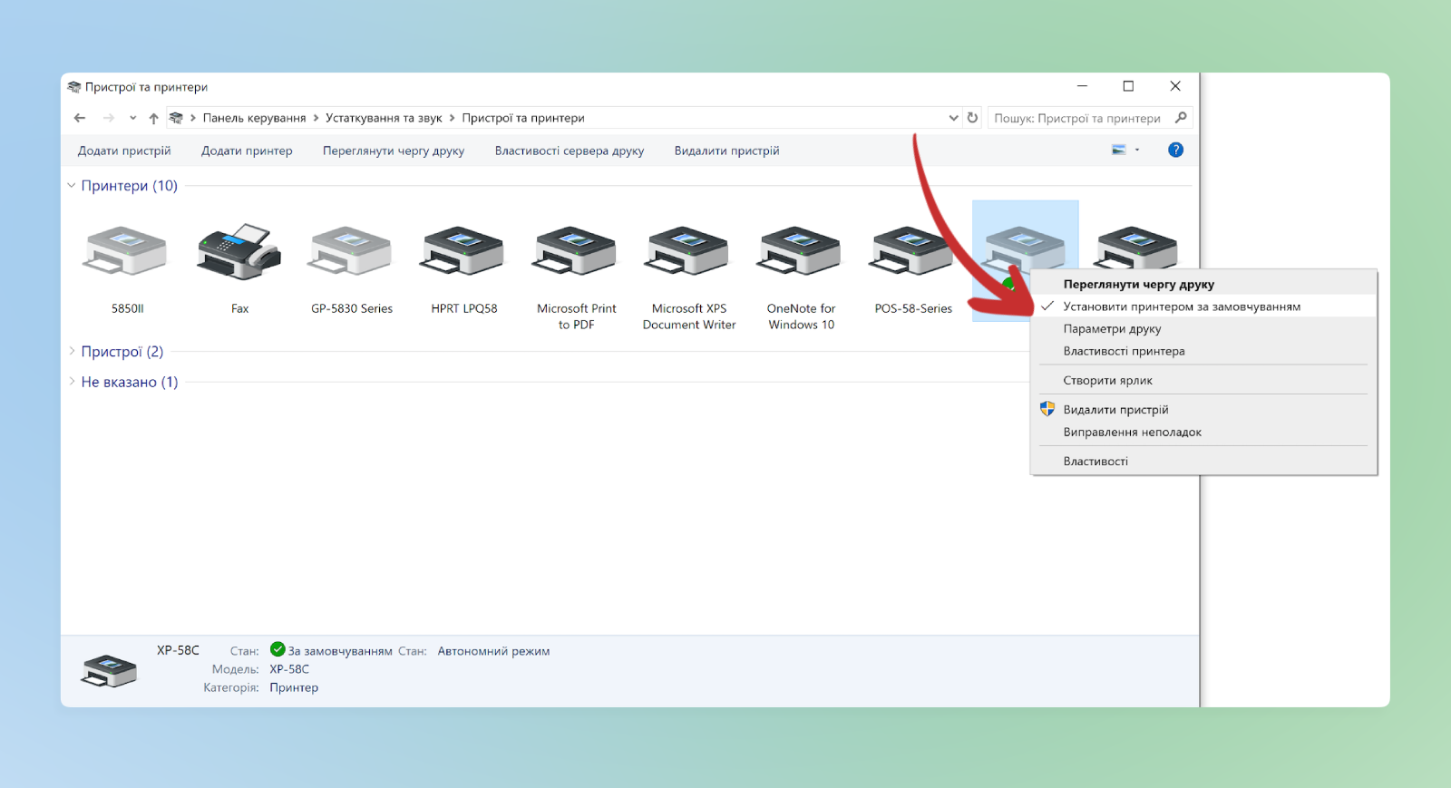 На потрібний принтер натискаємо правою кнопкою миші та ставимо Використовувати за замовчуванням