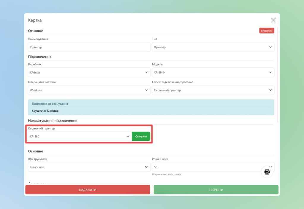 • Спосіб підключення – Системний принтер;