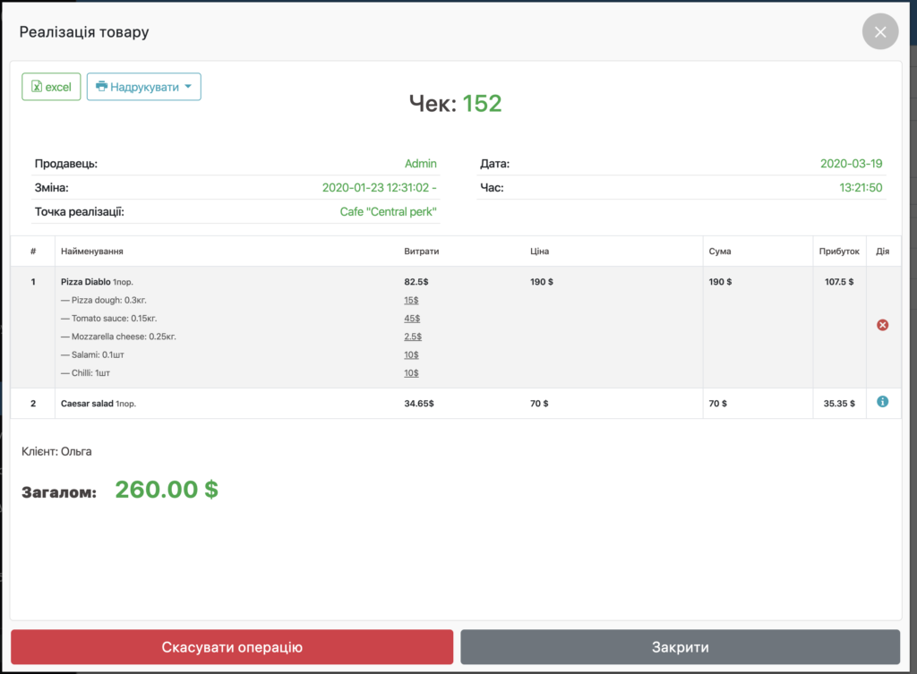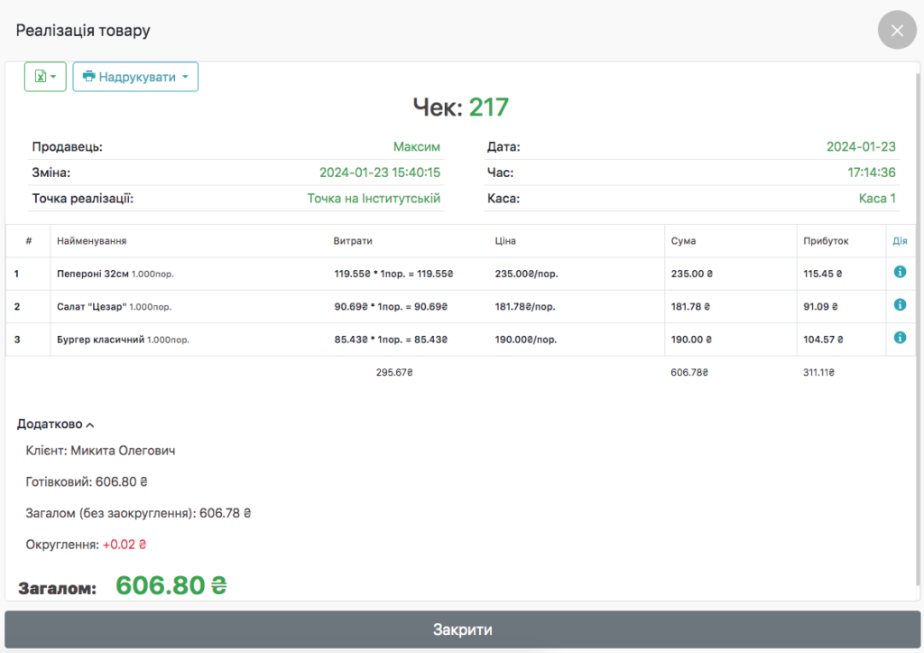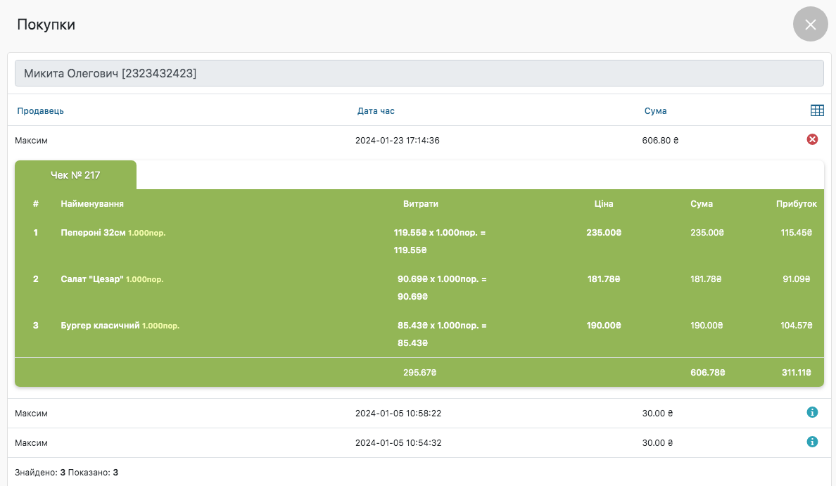 - У вікні Покупки ви можете подивитися вміст чека: