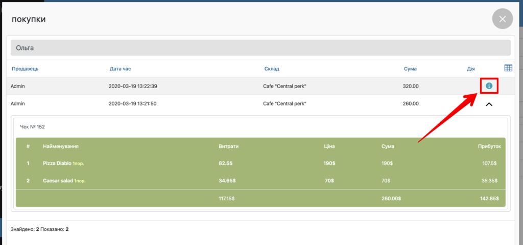 - У вікні Покупки ви можете натиснути на конкретний чек, щоб переглянути його вміст