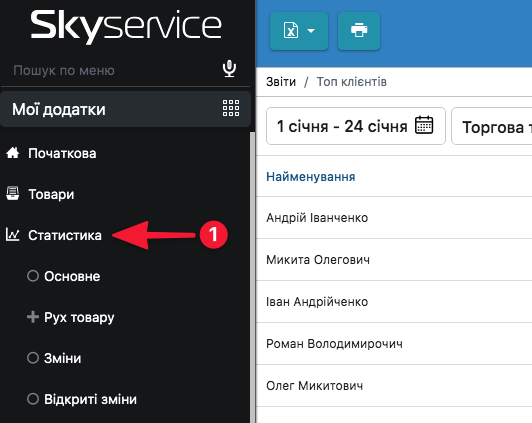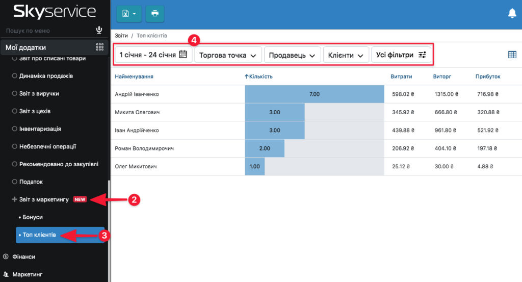 - Відкрийте пункт Звіт з маркетингу → Топ клієнтів