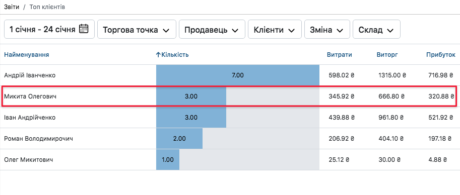- У розділі Топ продажів натискаєте на поле з потрібним клієнтом