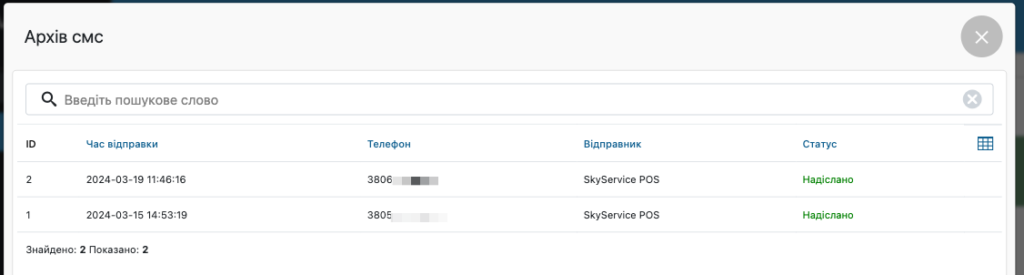 - Час відправки – дата та час коли було надіслано SMS