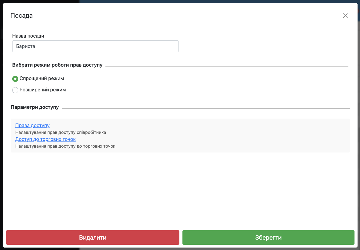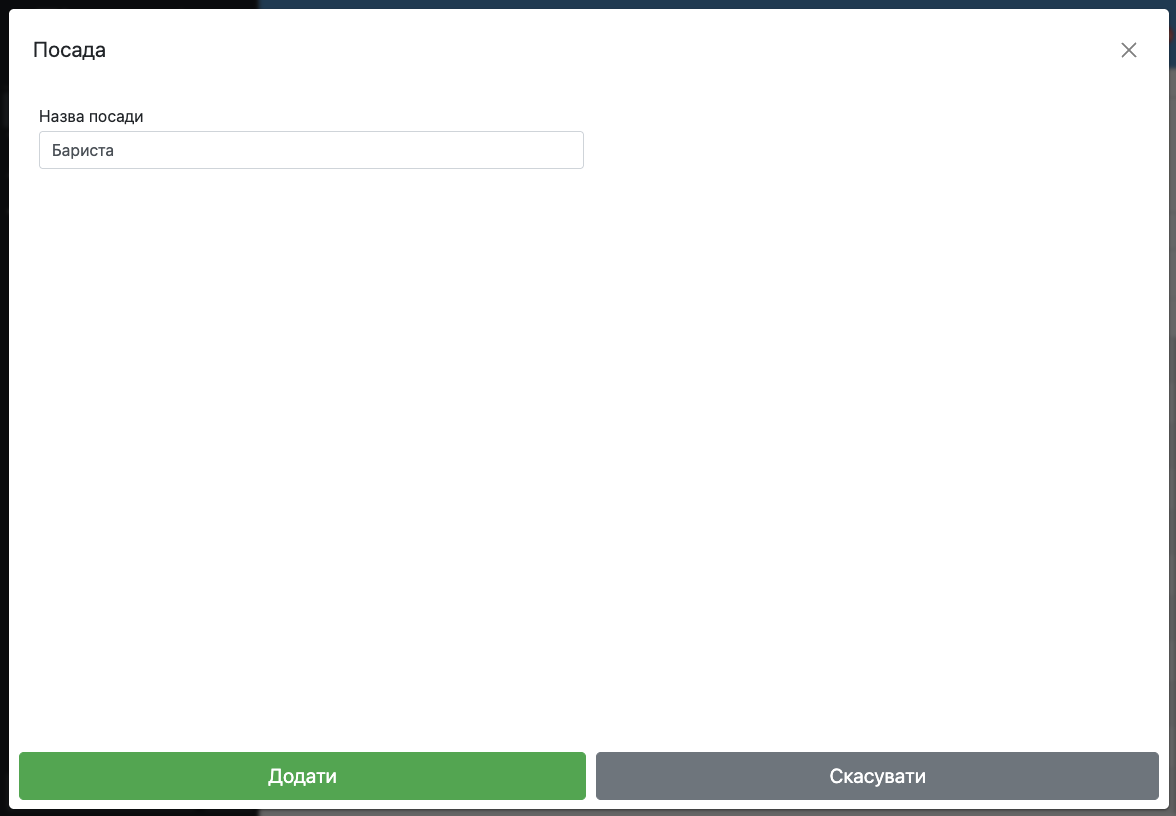 Посада — це роль, яку виконує співробітник у вашій компанії. Наприклад: офіціант, бармен, адміністратор, касир, менеджер, бухгалтер тощо.