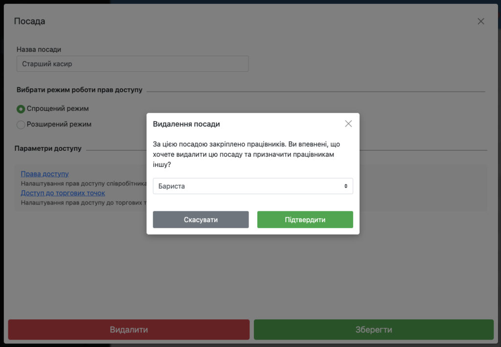 ❗️ При видалені посади Skyservice відобразить вікно в якому необхідно вибрати нову посаду для співробітників.