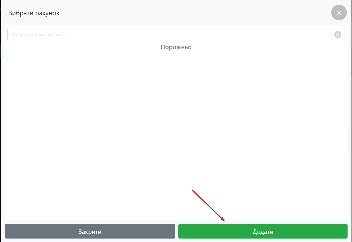 Після натискання “Вибрати рахунок” відкривається вікно, в якому можна додати новий рахунок, натиснувши кнопку “Додати”