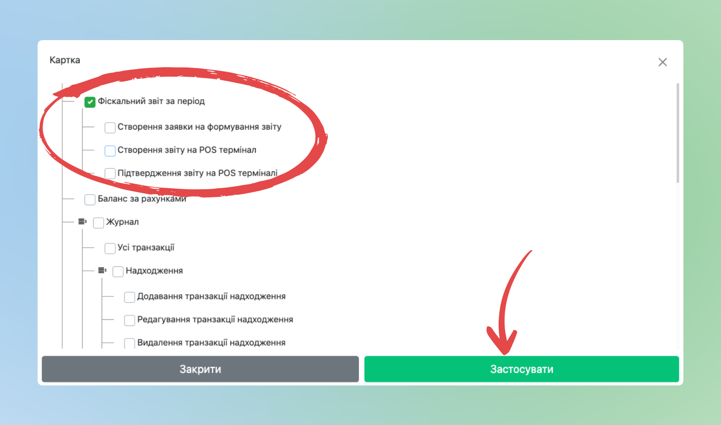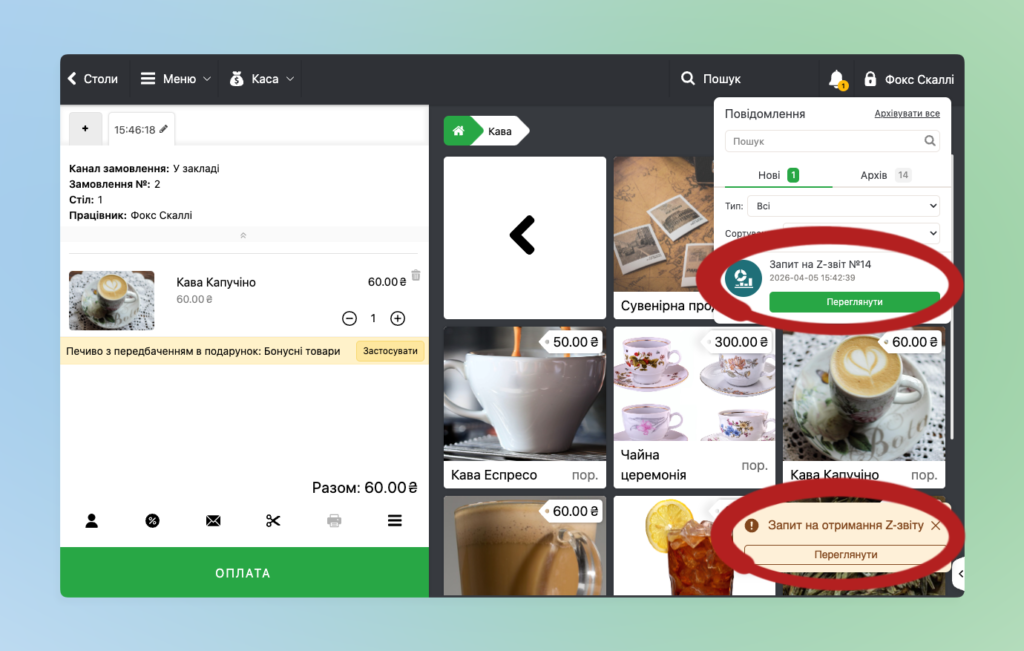 - Підтвердження звіту на POS терміналі – дає можливість співробітнику підтверджувати отримані з Панелі адміністрування заявки за Z-звітом