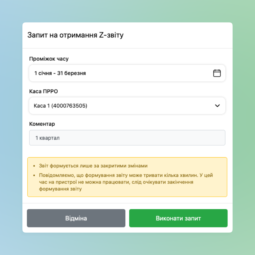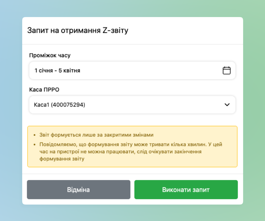 - Створення заявки на формування звіту – дає можливість співробітнику з Панелі адміністрування робити Заявку на отримання Z-звітів