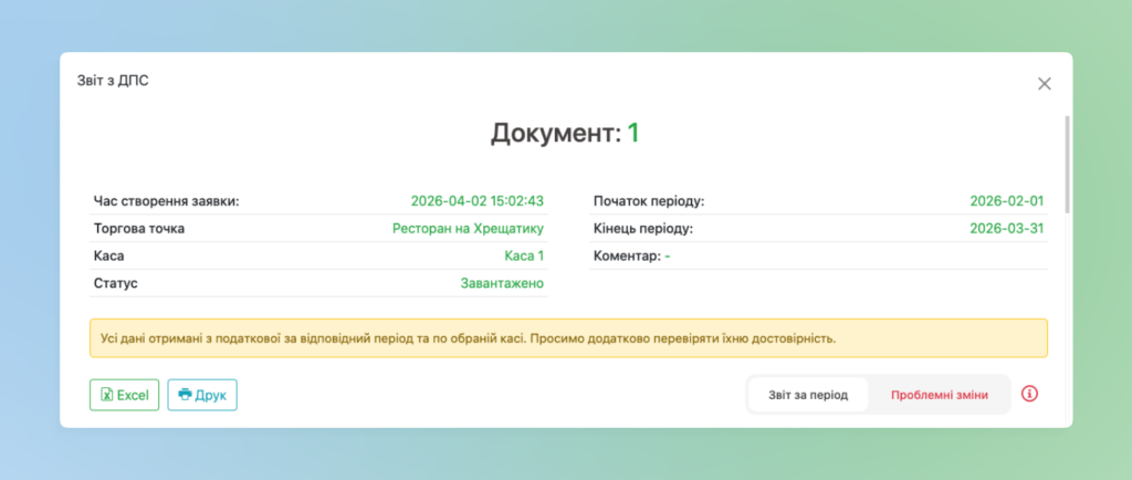- Початок та Кінець періоду – період, за котрий була вивантажена фіскальна інформація в поточний звіт
