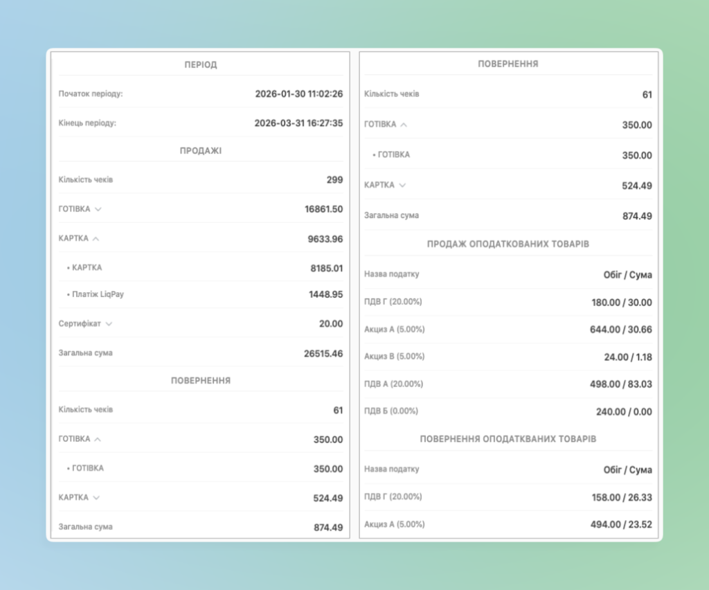 На поточному прикладі звіт був сформований в періоді 01.02-31.03. Також наявна зміна, котра була відкрита 30.01, а закрита 02.02.