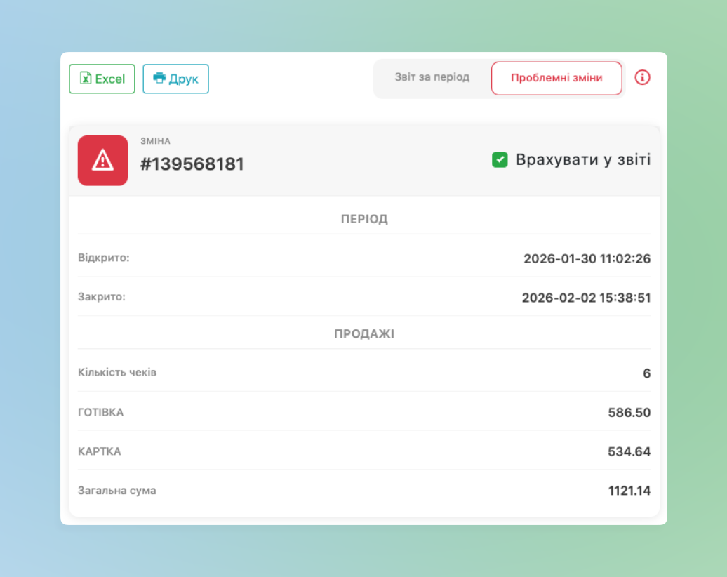 Це говорить про те, що в звіті наявні зміни, які лише частково потрапили у обраний період, тобто відкриті до періоду звіту, а закриті вже в ньому або навпаки – в обраному періоді тільки відкриття зміни, а закриття поза звітом.