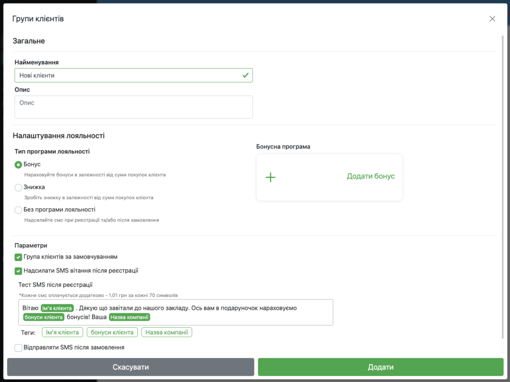 - Без програми лояльності – до групи не будуть застосовані ніяк програми лояльності, тільки надсилання SMS (у разі активації)