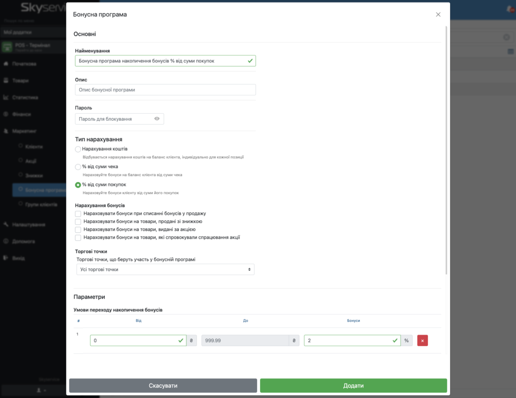 - якщо кроком вище було обрано тип програми лояльності Бонус або Знижка