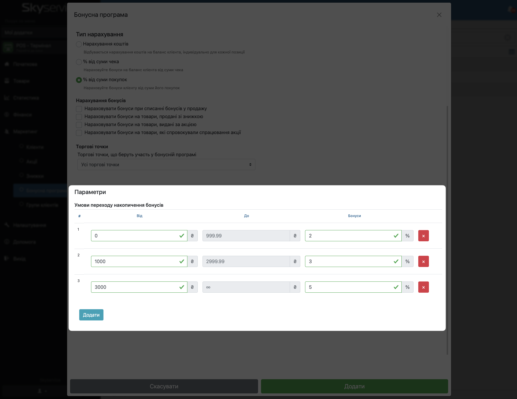 - Бонус – дозволяє нараховувати бонуси в залежності від суми покупок