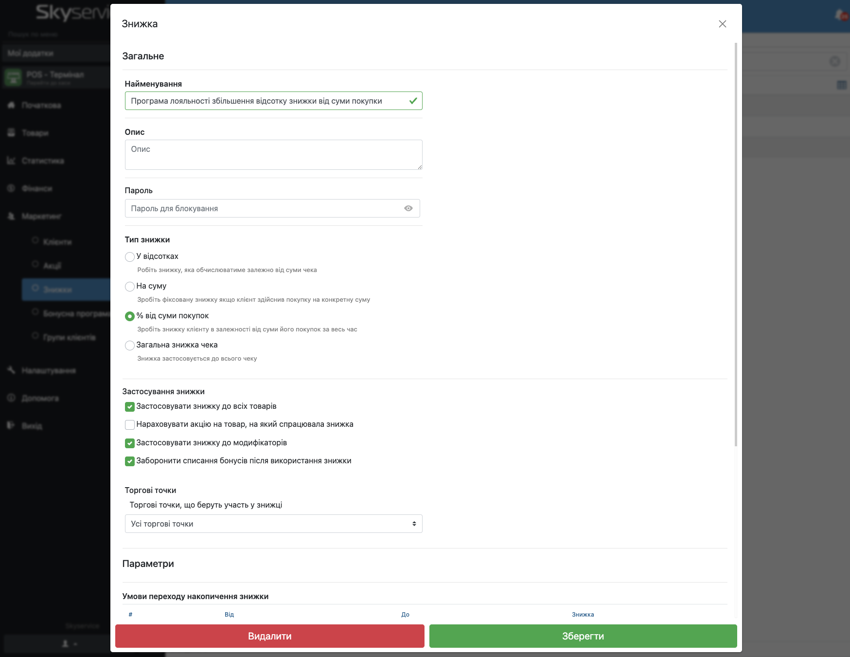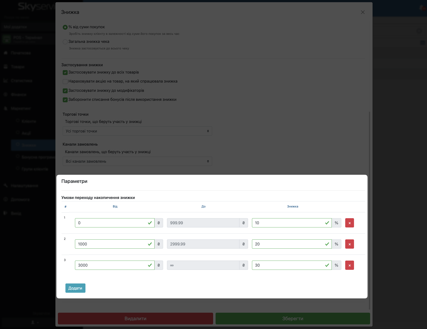 - У блоці Параметри налаштуйте умови переходу накопичення знижки