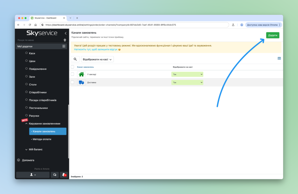 - Активуйте Канали замовлень, щоб відобразити список каналів до торгової точки
