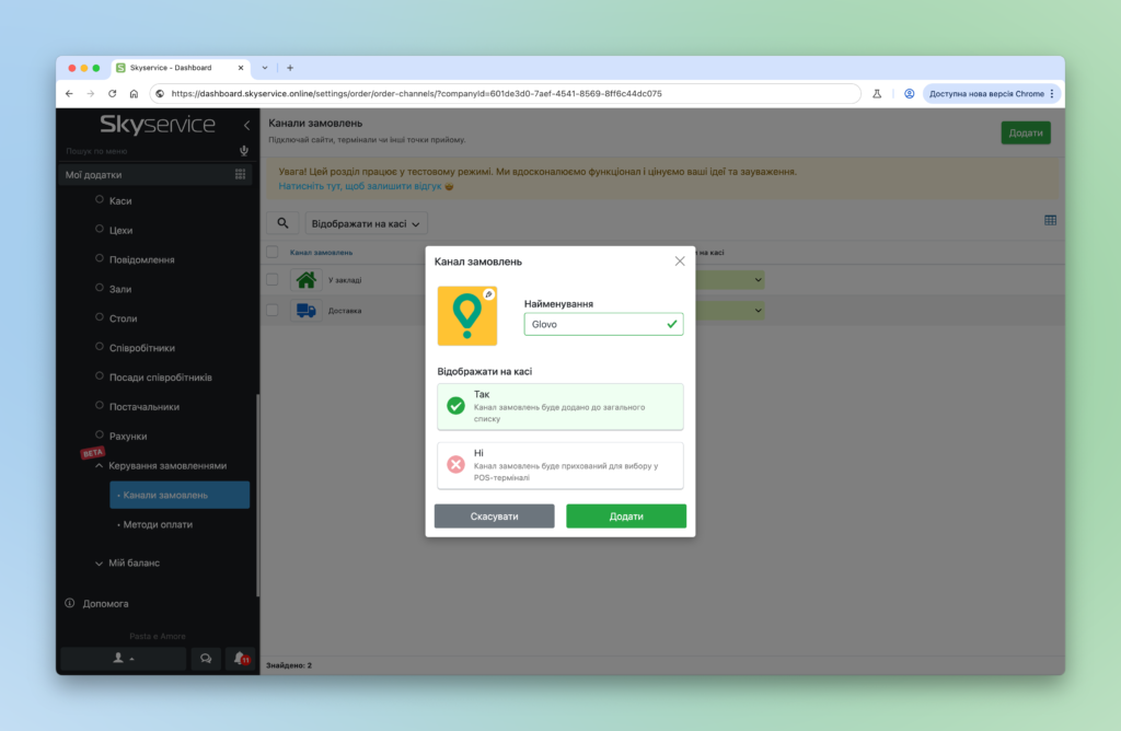 - Відображати на касі – виберіть Так, якщо необхідно вже відображати канал замовлення в касі.