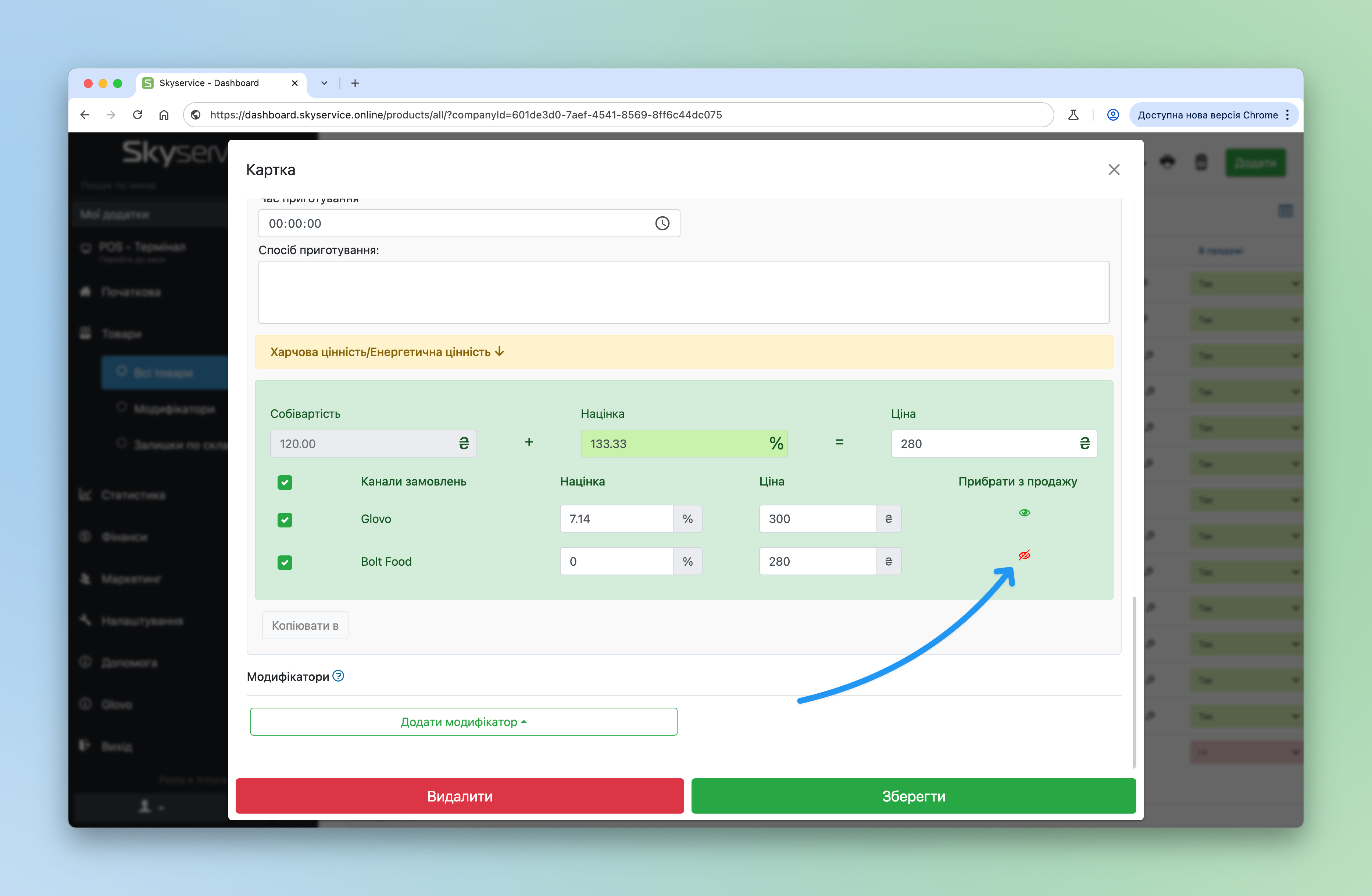 - Біля необхідного каналу замовлення натисніть на іконку прибирання з продажу