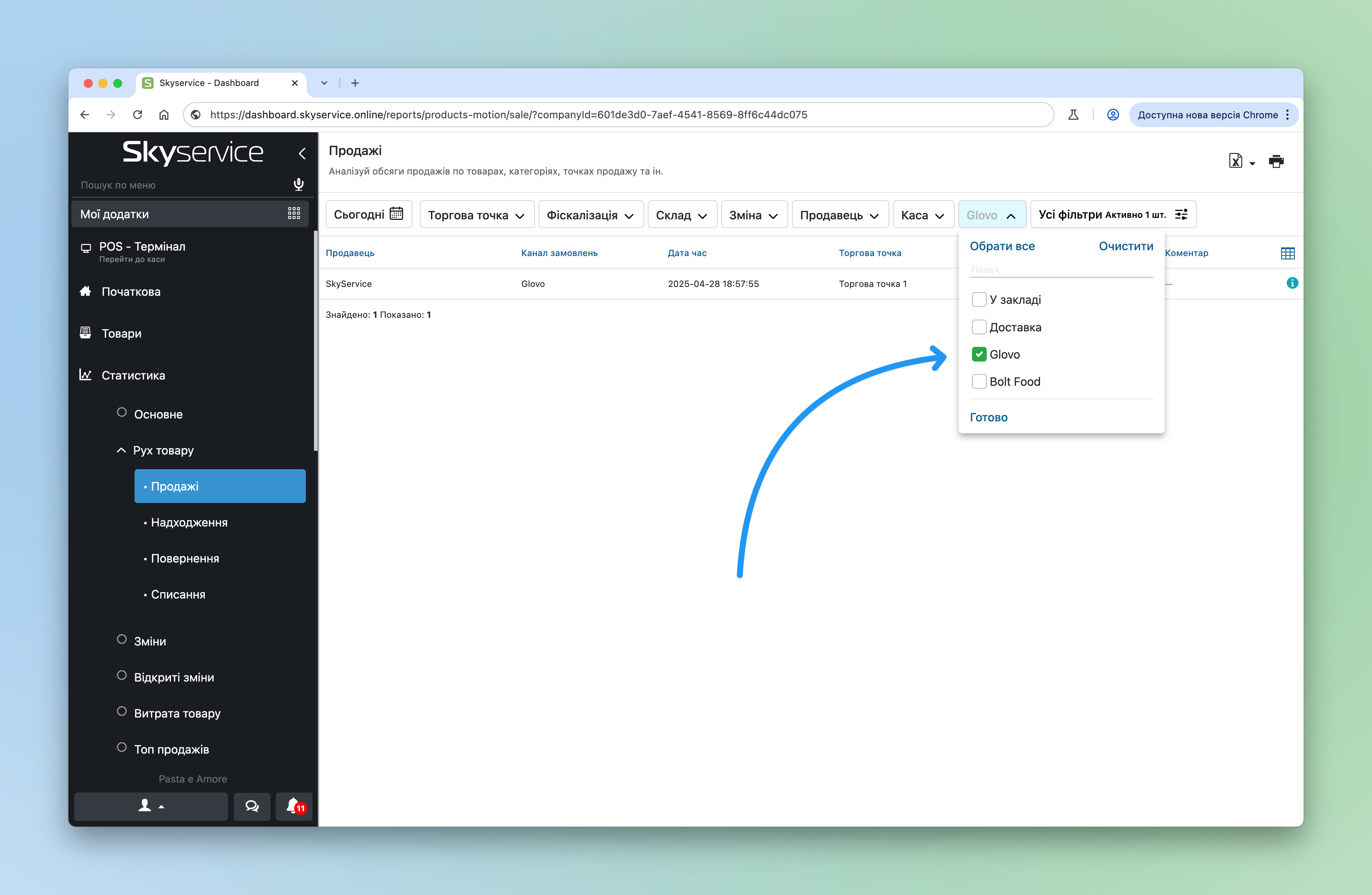 - В фільтрі Канали замовлення виберіть необхідні, наприклад “Доставка“, “Glovo“