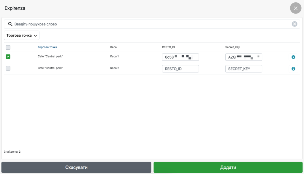 - Активуйте точки та каси, на яких працюватиме Expirenza by mono, для цього вкажіть: