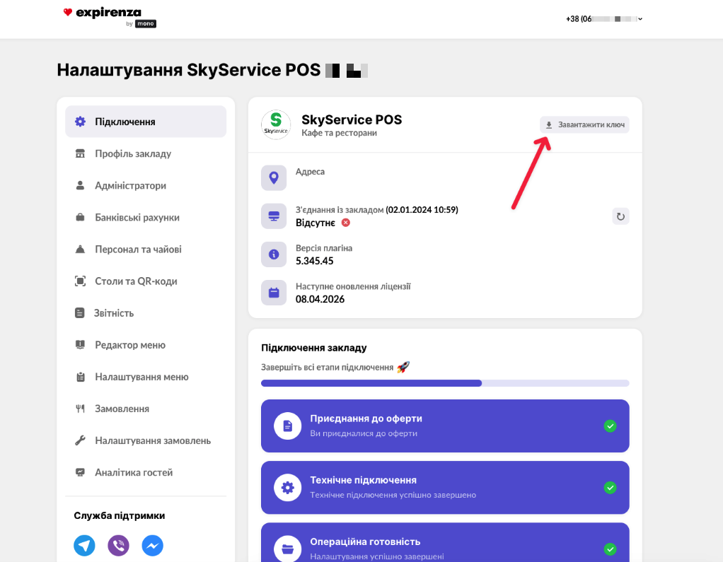 ℹ️ Для перевірки підключення до Expirenza by mono, необхідно перейти в POS-термінал або оновити сторінку.