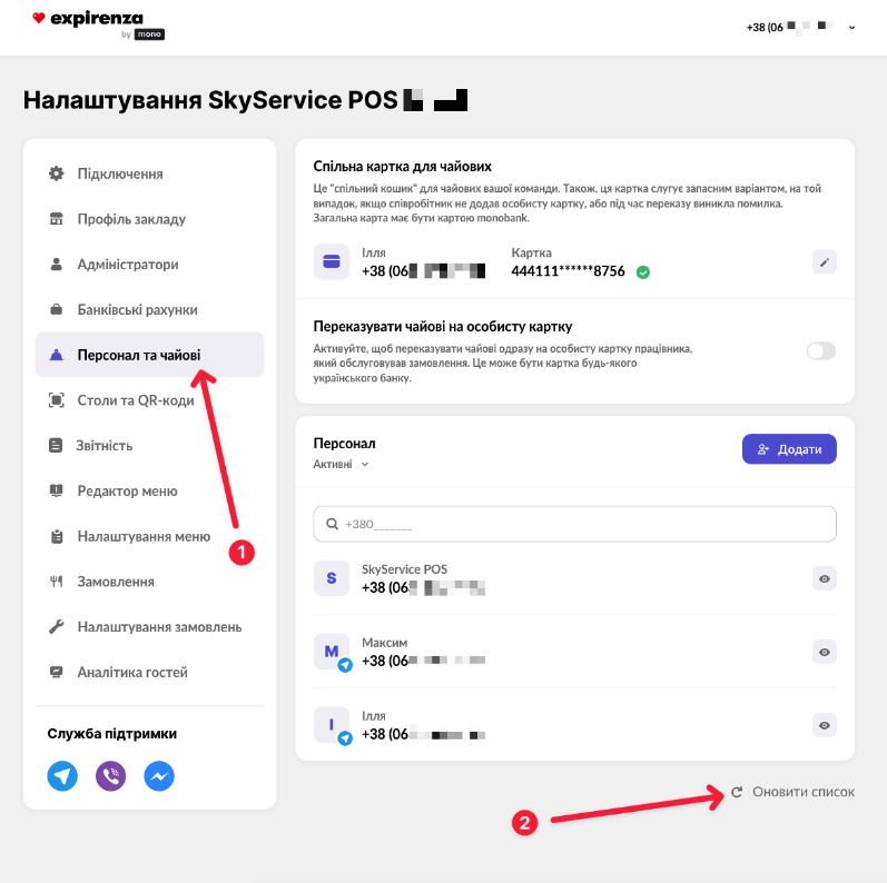 - ℹ️ Після створення картки співробітника, необхідно перезапустити POS-термінал, при запуску йде підключення до Expirenza by mono, та після цього можливо знову оновити список, щоб отримати нові дані.