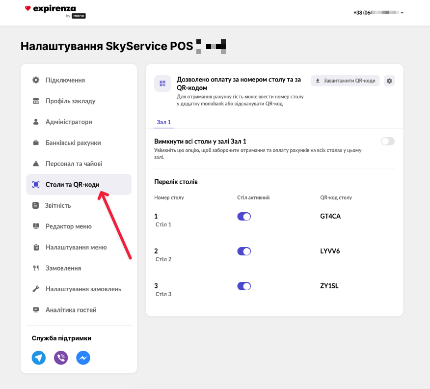 - Відкрийте розділ “Столи та QR-коди“
