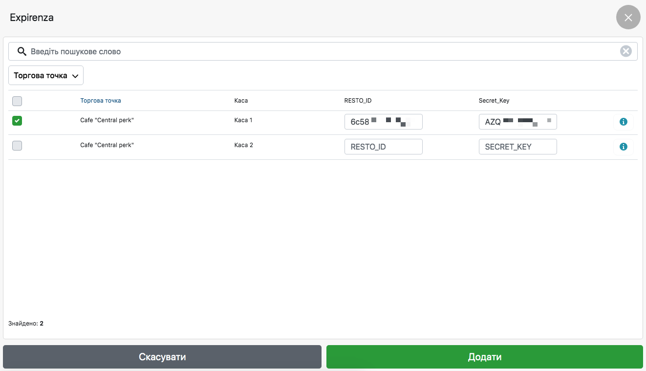 - ℹ️ Якщо “пташка” не обрана до точки та каси, у POS-терміналі не буде відбуватися підключення до Expirenza.