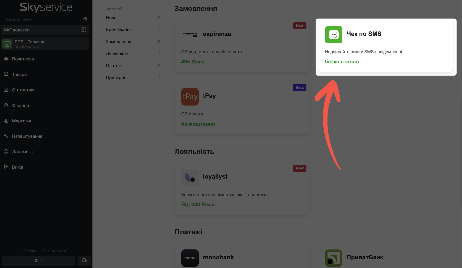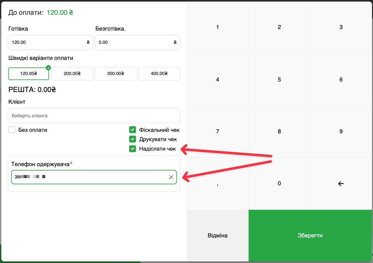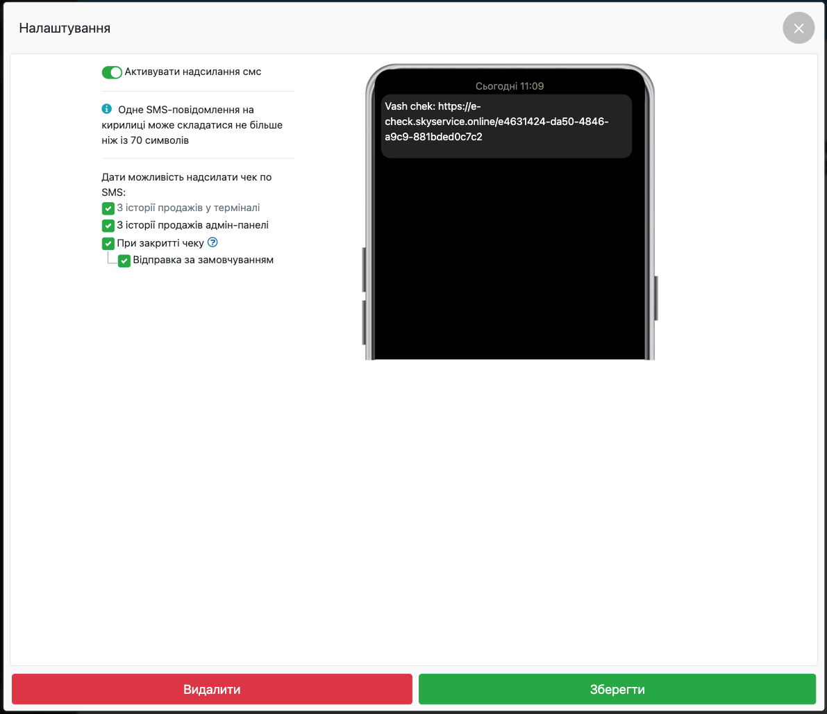 - При закритті чеку – активує можливість надсилання чека по SMS під час здійснення продажів