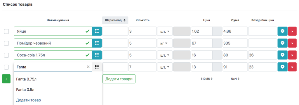 • Для пошуку/додавання товару досить ввести перші літери назви