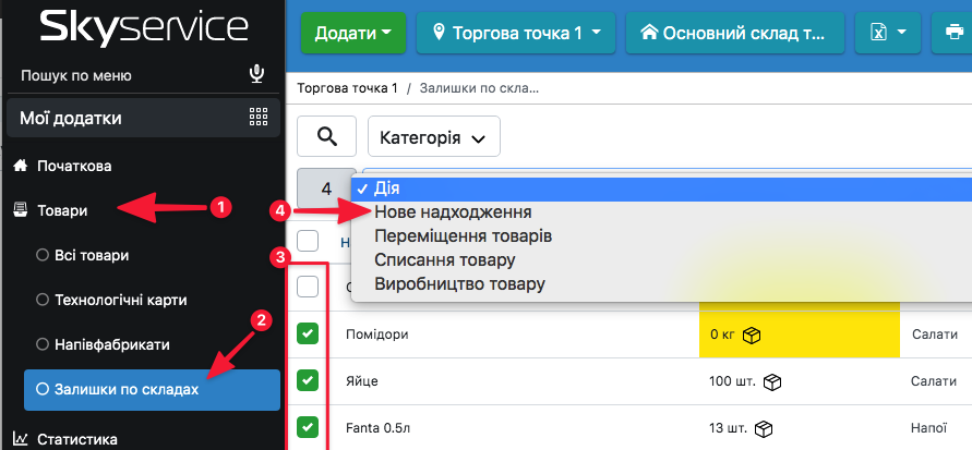 У Адмін-панелі перейдіть в розділ Початкова, виберіть потрібну торгову точку (якщо у вас їх декілька), і натисніть Прихід товару