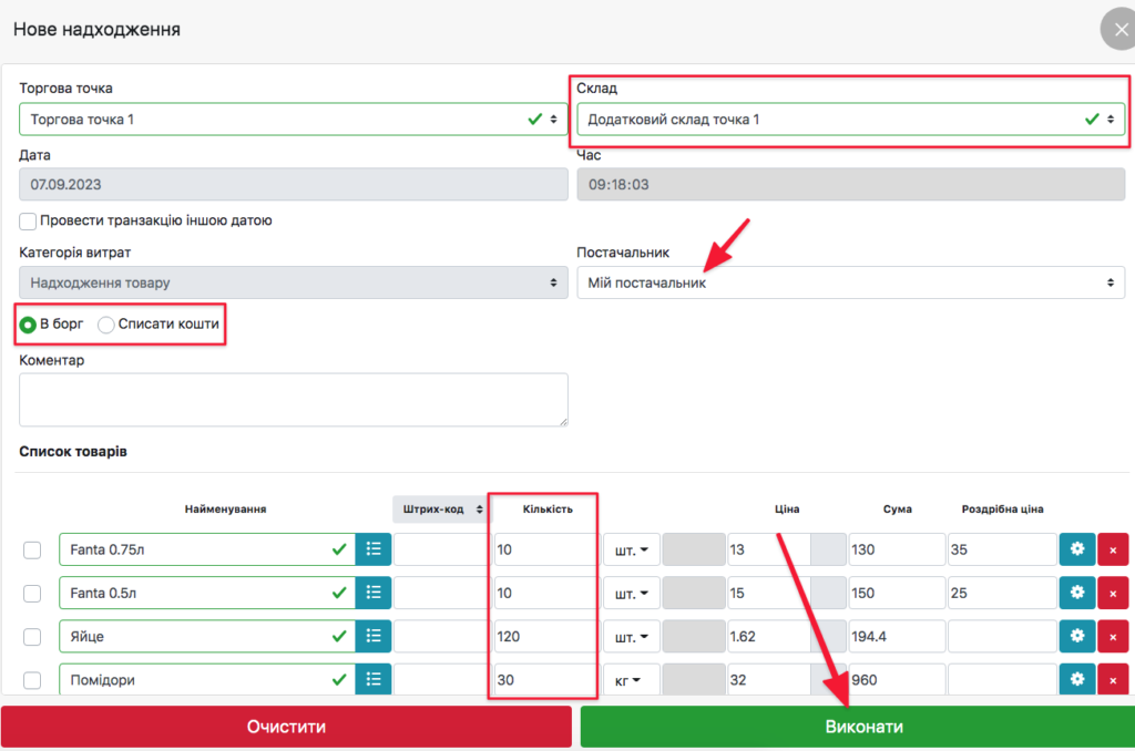 • Виберіть спосіб розрахунку з постачальником (в борг або з створеного рахунку)