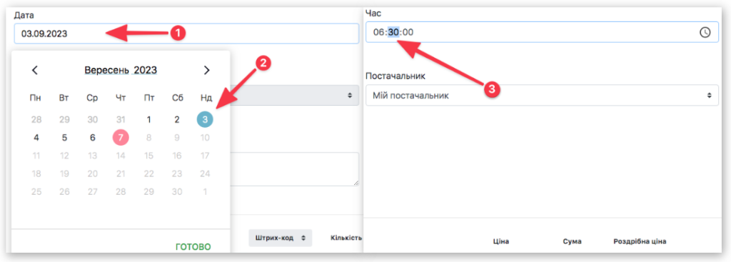 • Оберіть Торгову точку та Склад, на який робите прихід