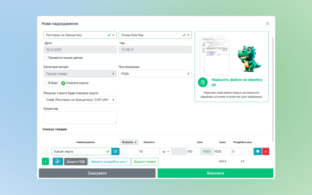 • Додайте товари/інгредієнти, надходження яких виконуєте