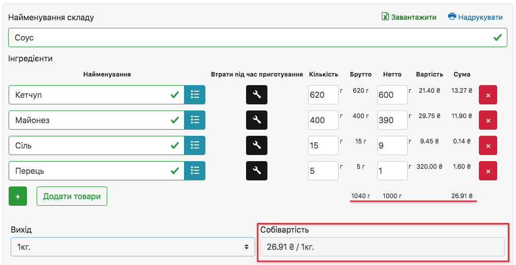 👉 При створенні напівфабрикату, ви могли помітити, що його собівартість підраховується автоматично при додаванні інгредієнтів до його рецептури.