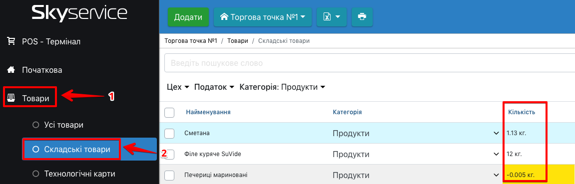 У колонці Кількість відображаються залишки товарів