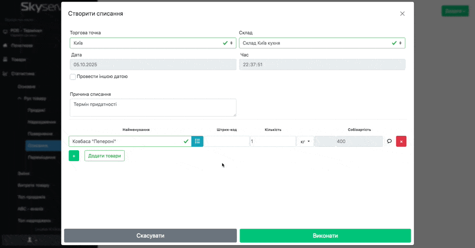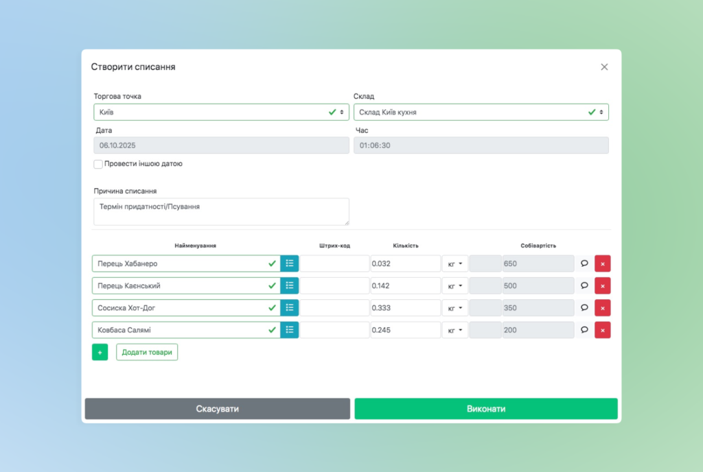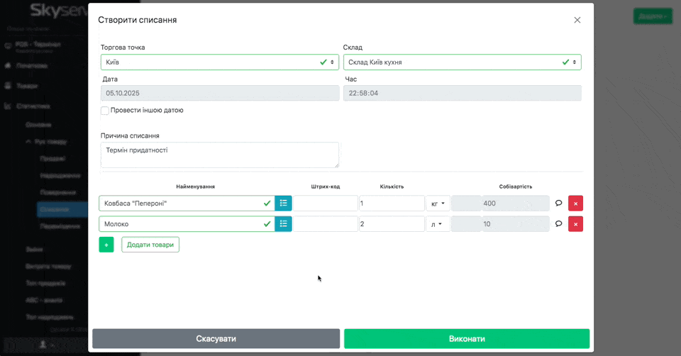 - Оберіть Торгову точку та Склад, з якого робите списання