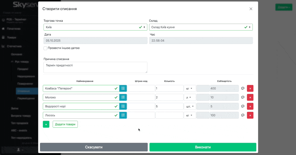 - Відмітьте товари, списання яких хочете виконати
