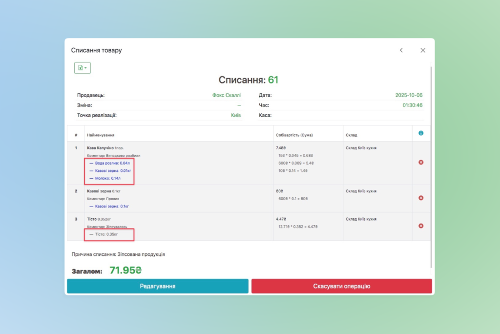 - Технологічної карти → списуються її складові в момент збереження документа;